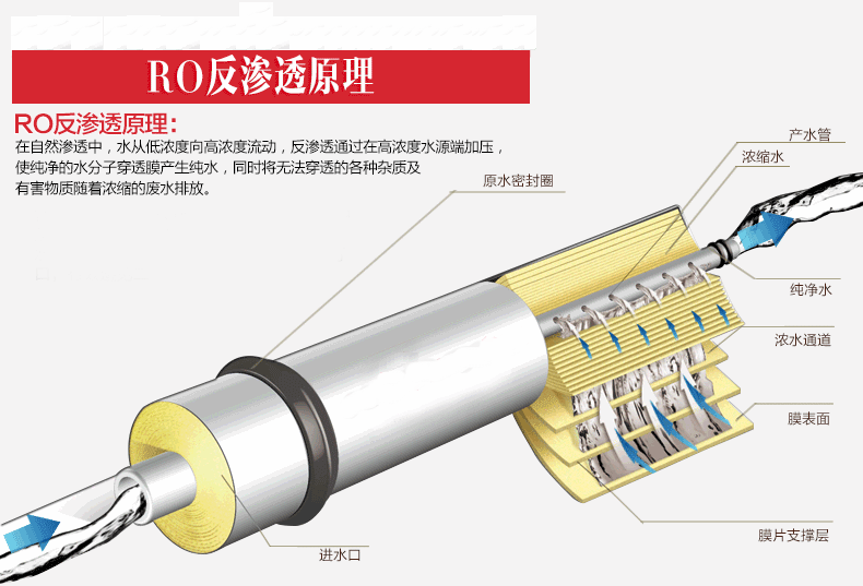 RO是英文 Reverse Osmosis membrane 的縮寫,中文意思是(逆滲透),一般水的流動(dòng)方式是由低濃度流向高濃度,水一旦加壓之后,將由高濃度流向低濃度,亦即所謂逆滲透原理:由于 RO 膜的孔徑是頭發(fā)絲的一百萬分之五( 0.0001 微米) , 一般肉眼無法看到,******、病毒是它的 5000 倍,因此,只有水分子及部分有益人體的礦物離子能夠通過,其它雜質(zhì)及重金屬均由廢水管排出,所有海水淡化的過程,以及太空人廢水回收處理均采用此方法,因此 RO 膜又稱體外的高科技人工腎臟