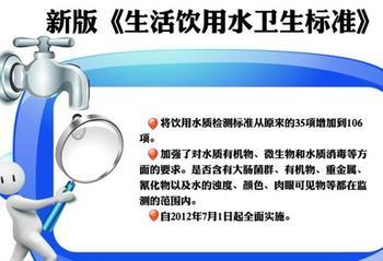 2007年7月1日,由國家標(biāo)準(zhǔn)委和衛(wèi)生部聯(lián)合發(fā)布的《生活飲用水衛(wèi)生標(biāo)準(zhǔn)》(GB 5749-2006)強制性國家標(biāo)準(zhǔn)和13項生活飲用水衛(wèi)生檢驗國家標(biāo)準(zhǔn)將正式實施。這是國家21年來首次對1985年發(fā)布的《生活飲用水標(biāo)準(zhǔn)》進行修訂。